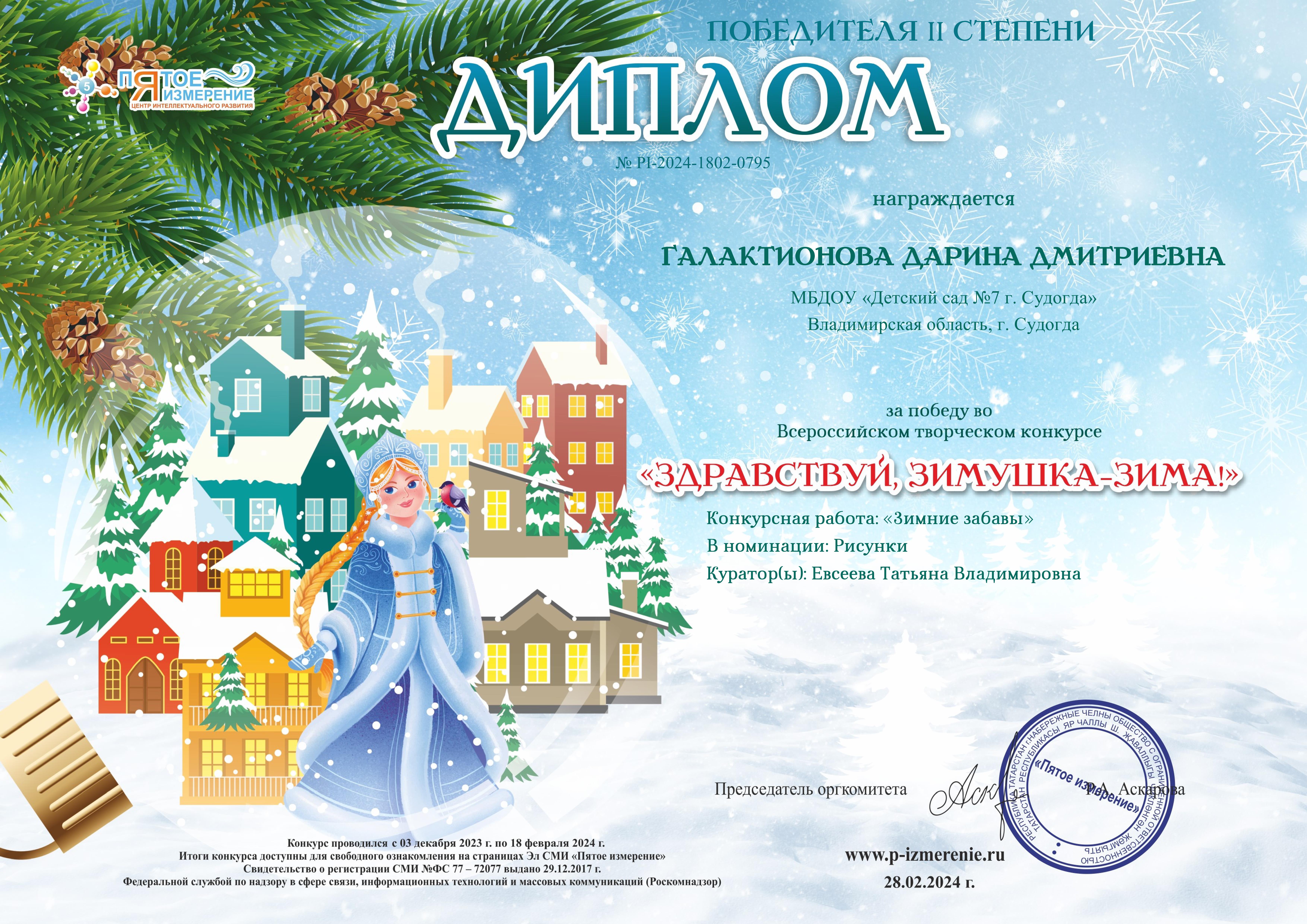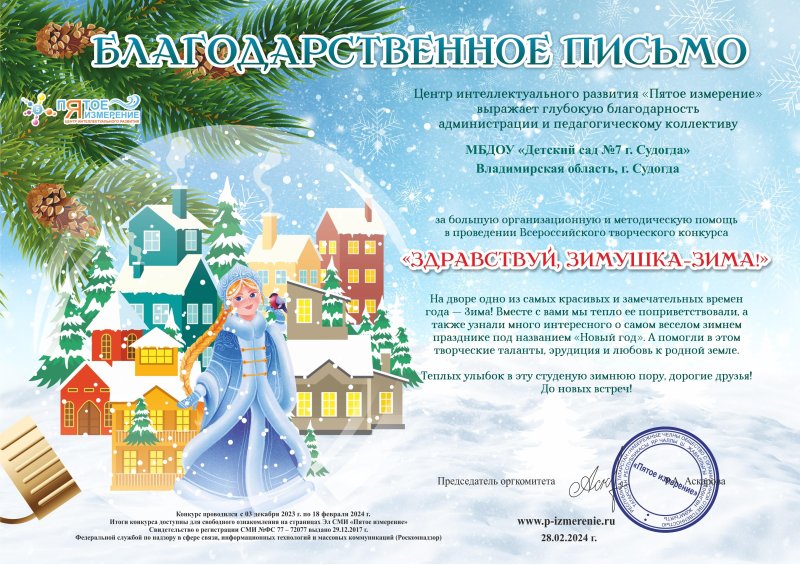 Благодарность Центр интеллектуального развития "Пятое измерение" - "Здравствуй, зимушка-зима!"